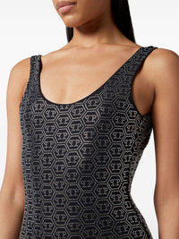embellished monogram swimsuit Highlights - Black - Stretch-design - Monogram pattern - Rhinestone embellishment - Round neck - Wide shoulder straps - Open back - Be mindful to try on swimwear over your own garments. Imported Composition Glass Fiber 100%, Polyamide 80%, Elastane 20%