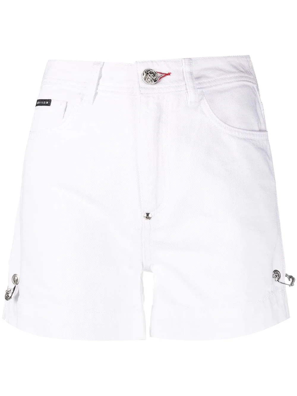 safety-pin denim shorts white belt loops concealed front fastening classic five pockets safety pin detail Made in Italy Composition Outer: Cotton 100% Lining: Polyester 65%, Cotton 35% SIZE & FIT Model measurements Height 5 ft 11 in(1.8 m) Bust/Chest 31.1 in(79 cm) Hips 34.25 in(87 cm) Waist 22.83 in(58 cm) FittingInformation This piece fits true to size. We recommend you get your regular size Cut for a slim fit Made with a mid-weight non-stretch fabric Washing instructions Do Not Wash/Do Not Dry Clean