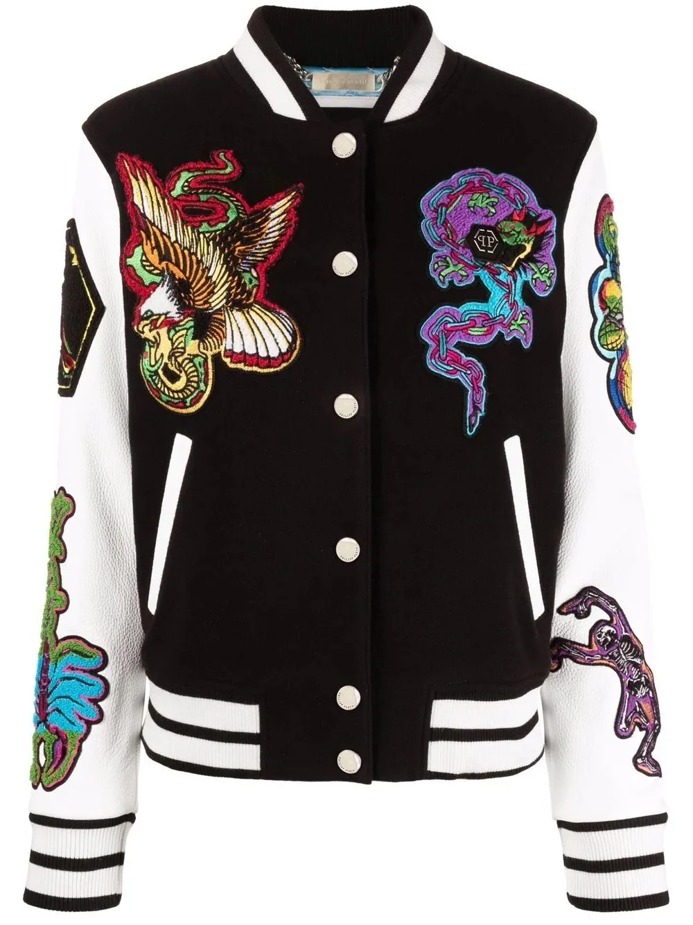 embroidered-patches colour-block varsity jacket In a black and white hue, this college varsity bomber jacket from Philipp Plein SS22 is decorated with an assortment of tattoo inspired embroidered patches. Imported Composition Outer: Calf Leather 100%, Polyester 64%, Viscose 33%, Spandex/Elastane 3% Lining: Polyester 100% Washing instructions Specialist Cleaning