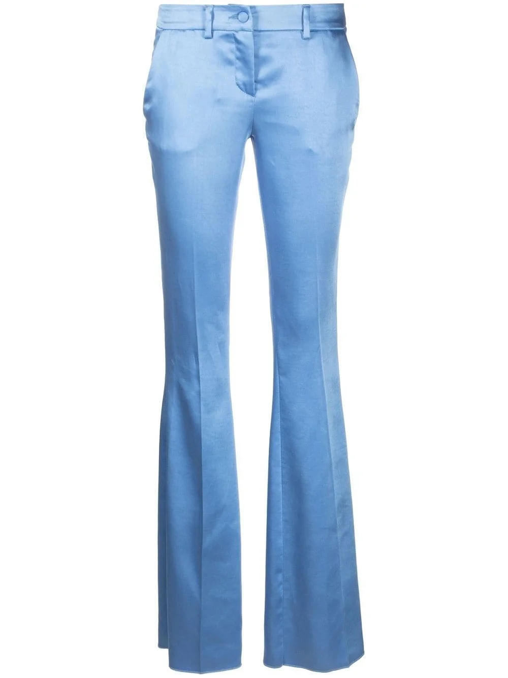 flared satin trousers baby blue satin finish belt loops front button and zip fastening two rear welt pockets flared Made in Italy Composition Polyester 98%, Spandex/Elastane 2% Washing instructions Dry Clean Only