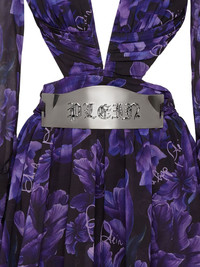 floral-print chiffon mini dress Highlights - Black - Purple - Chiffon - All-over floral print - Single rear button fastening - Plunging v-neck - Long sleeves - Cut-out detailing - Logo plaque - Open back - Ruffle hem - Thigh-length Made in Italy Composition Metal 100%, Polyester 100%