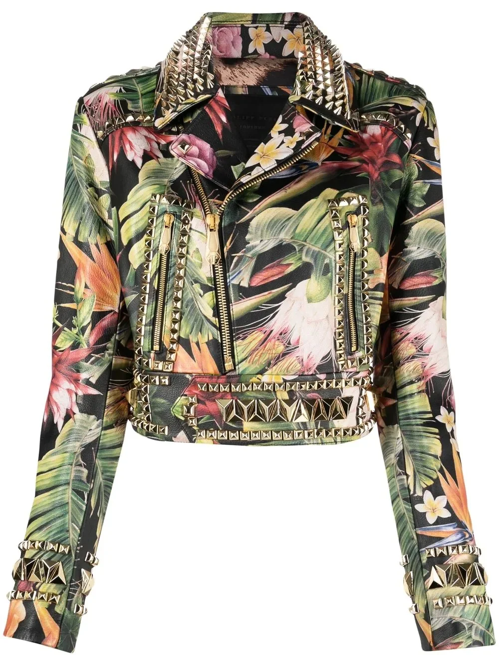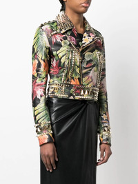 floral-print studded biker jacket multicolour all-over floral print stud detailing front zip fastening long sleeves Imported Composition Outer: Polyester 100% Lining: Polyester 97%, Elastane 3% SIZE & FIT Model measurements Height 5 ft 10 in(1.78 m) Bust/Chest 29.52 in(75 cm) Hips 35.03 in(89 cm) Waist 22.83 in(58 cm) FittingInformation This piece fits true to size. We recommend you get your regular size Cut for a slim fit Made with a heavyweight fabric Washing instructions Specialist Cleaning