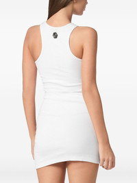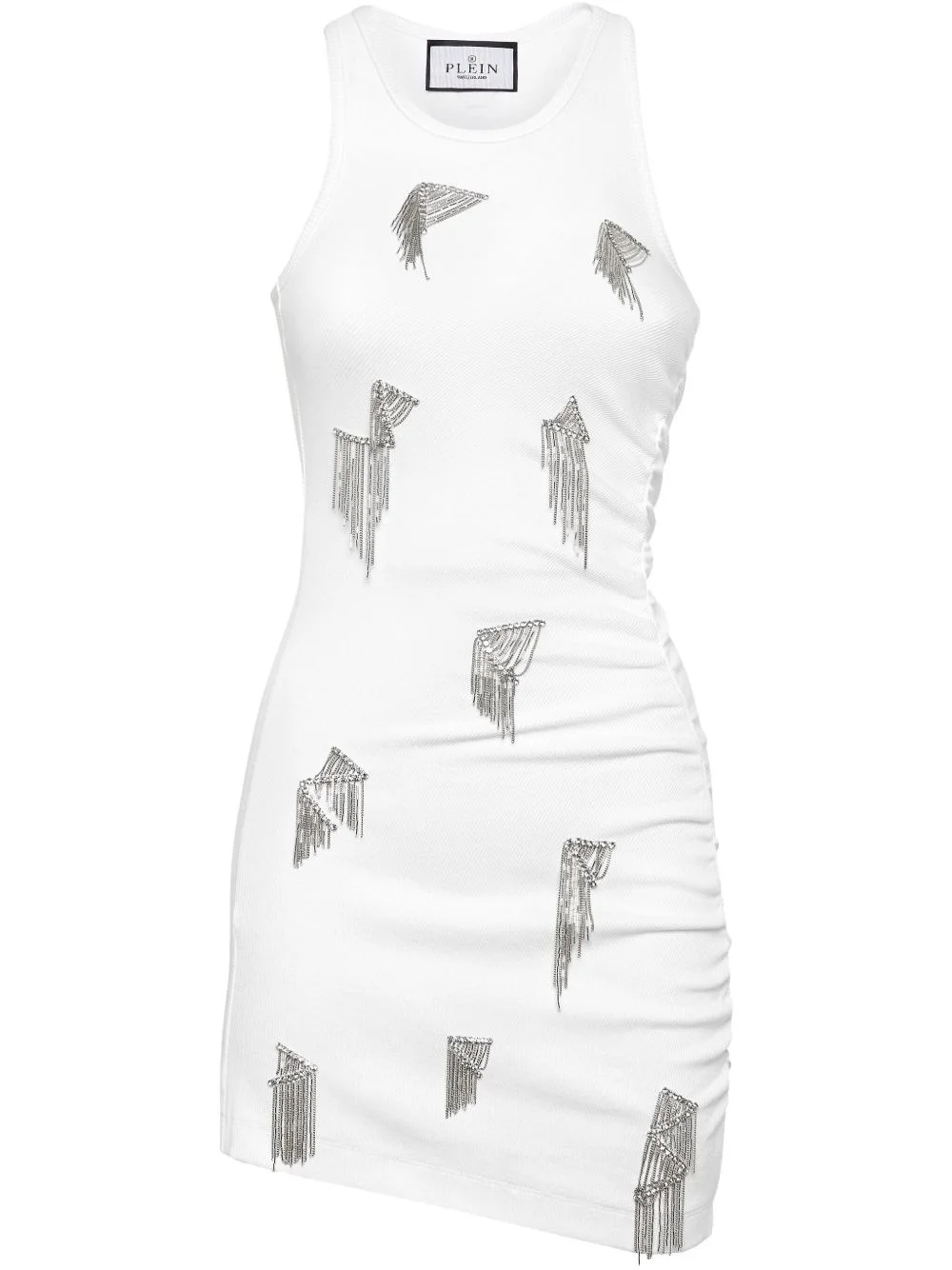 fringe-detail ribbed mini dress Highlights - White - Crew neck - Sleeveless - Crystal embellishment - Ruched detailing Imported Composition Brass 100%, glass 100%, Cotton 95%, Elastane 5%