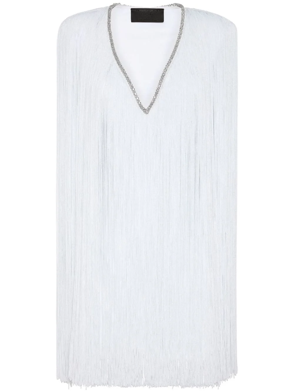 fringed v-neck mini dress Highlights - White - Fringe detailing - Crystal embellishment - V-neck - Long slit sleeves - Thigh-length - Straight hem Made in Italy Composition Metal 100%, Polyamide 78%, Elastane 22%