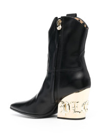 Gothic Plein CowBoy ankle boots black/gold-tone calf leather stud detail leopard print lining engraved logo embossed logo to the rear branded insole pull-tab at the opening pointed toe side zip fastening ankle-length mid block heel Made in Italy Composition Outer: Calf Leather 100% Lining: Calf Leather 100% Sole: Calf Leather 100% SIZE & FIT Measurement CIRCUMFERENCE 11.02 in(28 cm) HEEL 3.34 in(8.5 cm) HEIGHT 7.48 in(19 cm)