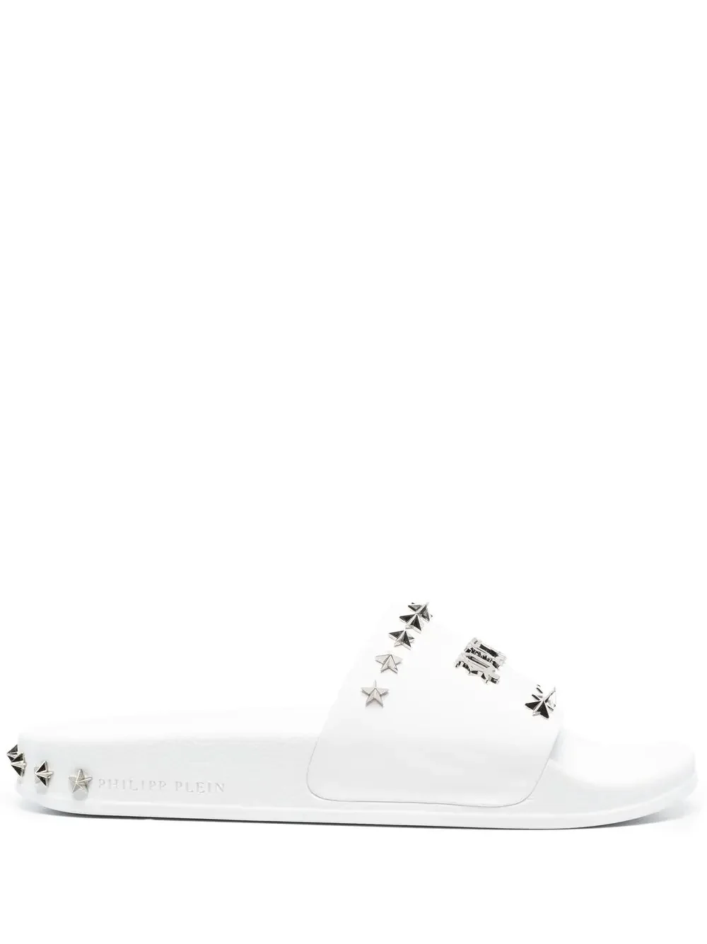 Gothic Plein stud-studded slides Gothic Plein stud-studded sandals from PHILIPP PLEIN featuring cloud white, stud embellishment, open toe and flat rubber sole. Made in Italy Composition Outer: Rubber 100% Lining: Rubber 100%, Fabric 100% Sole: Rubber 100% SIZE & FIT Measurement HEEL 0.98 in(2.5 cm) Sole height 0.59 in(1.5 cm)