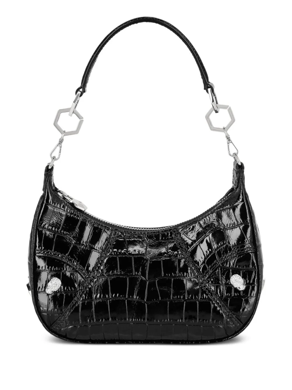 Gothic shoulder bag Highlights - Black - Calf leather - Embossed crocodile effect - Detachable shoulder strap - Top zip fastening - Skull stud embellishment - Logo plaque - Main compartment - Internal logo plaque - Leopard print lining Made in Italy Composition Outer: Calf Leather 100%