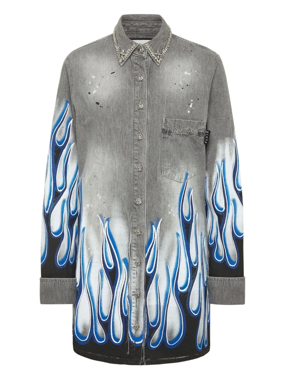 graphic-print denim shirt Highlights - Grey - Front button fastening - Chest patch pocket - Long sleeves - Logo print to the rear Imported Composition Cotton 100%, Polyester 100%, glass 100%, Metal 100%