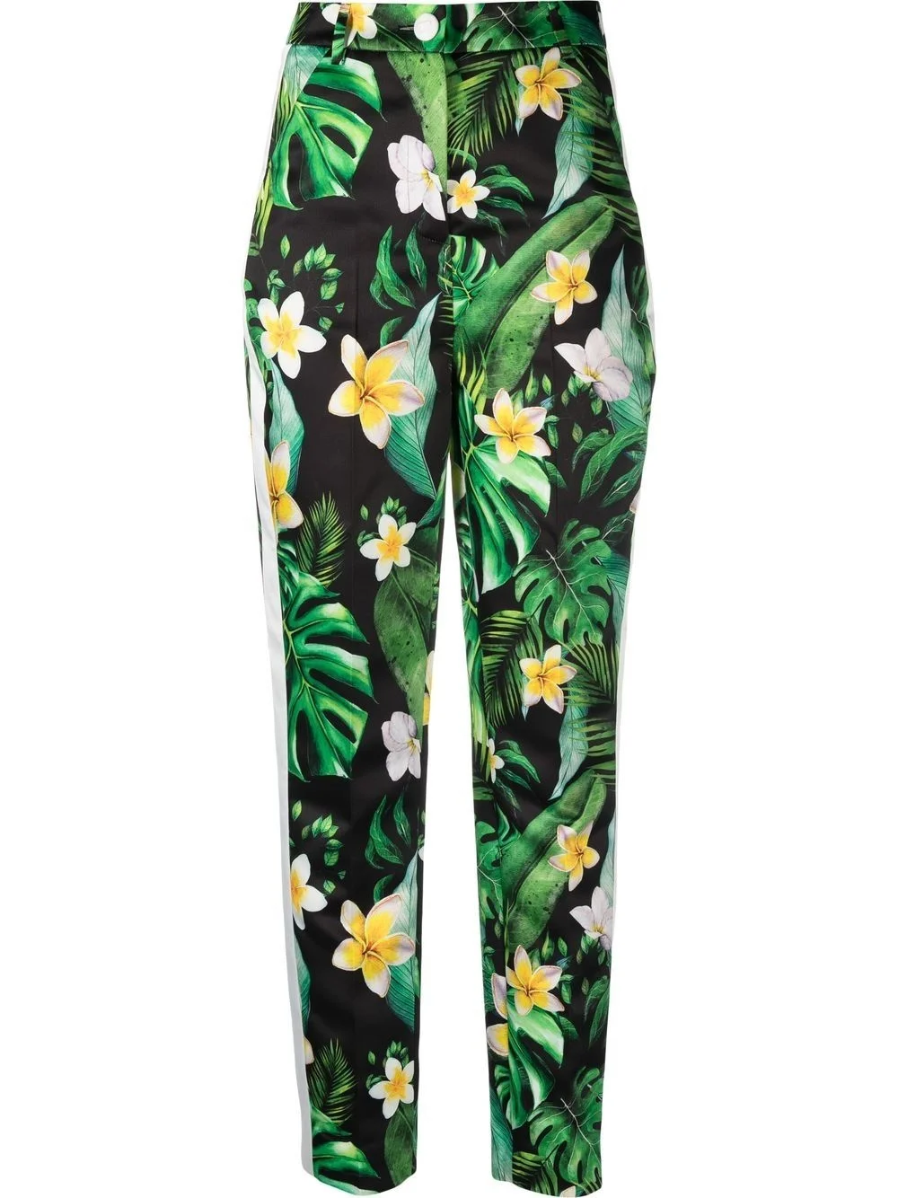 Hawaii-print high-waisted trousers fern green/multicolour all-over floral print high-waisted belt loops concealed fly and button fastening two side inset pockets two rear welt pockets Made in Italy Composition Outer: Polyester 100% Lining: Polyester 97%, Spandex/Elastane 3% Washing instructions Dry Clean Only
