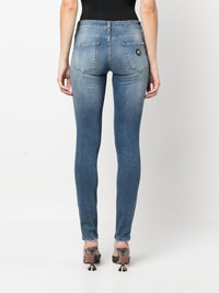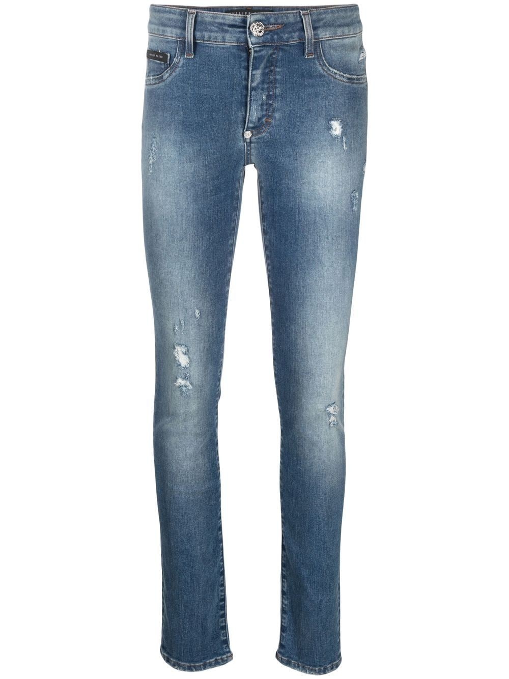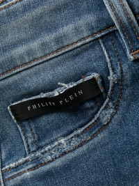high-rise skinny-cut jeans high-rise skinny-cut jeans from PHILIPP PLEIN featuring dark wash, distressed finish, mini logo tag, logo plaque, belt loops, front button and zip fastening, classic five pockets, high-waisted, skinny cut, shallow blue and stretch-cotton. Made in Italy Composition Cotton 90%, Spandex/Elastane 10% SIZE & FIT Model measurements Height 5 ft 11 in(1.8 m) Bust/Chest 32.3 in(82 cm) Hips 36.6 in(93 cm) Waist 24.8 in(63 cm) FittingInformation This piece fits true to size. We recommend you get your regular size Cut for a close fit Made with a mid-weight stretch fabric