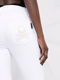 high-waisted flared jeans The skull and bones motif is an iconic visual from the Philipp Plein label and can be found decorating the rear pouch pockets in a shimmering gold-tone embroidered style adorning the snow-white garment. Imported Composition Outer: Cotton 100% Lining: Polyester 65%, Cotton 35% SIZE & FIT Model measurements Height 5 ft 10 in(1.77 m) Bust/Chest 32.28 in(82 cm) Hips 35.03 in(89 cm) Waist 25.19 in(64 cm) FittingInformation Designed with a flared hem, these jeans allow for a close fit at the waist with a slim fit over the leg and widening towards the hem Sturdy and hard-wearing, this denim piece offers no stretch This piece fits true to size – take your usual size Washing instructions Dry Clean Only