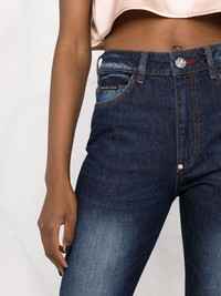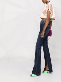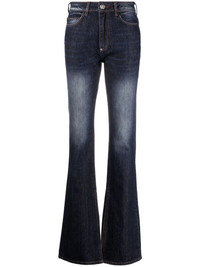 high-waisted flared jeans blue cotton denim stonewashed high waist belt loops front button and zip fastening classic five pockets logo patch to the rear flared hem slit hem Imported Composition Outer: Cotton 100% Lining: Polyester 65%, Cotton 35% SIZE & FIT Model measurements Height 5 ft 11 in(1.8 m) Bust/Chest 31.49 in(80 cm) Hips 36.61 in(93 cm) Waist 24.4 in(62 cm) FittingInformation This piece fits true to size. We recommend you get your regular size Designed to be fitted at the waist and through the thigh, loose from the knee Made with a mid-weight non-stretch fabric Washing instructions Hand Wash