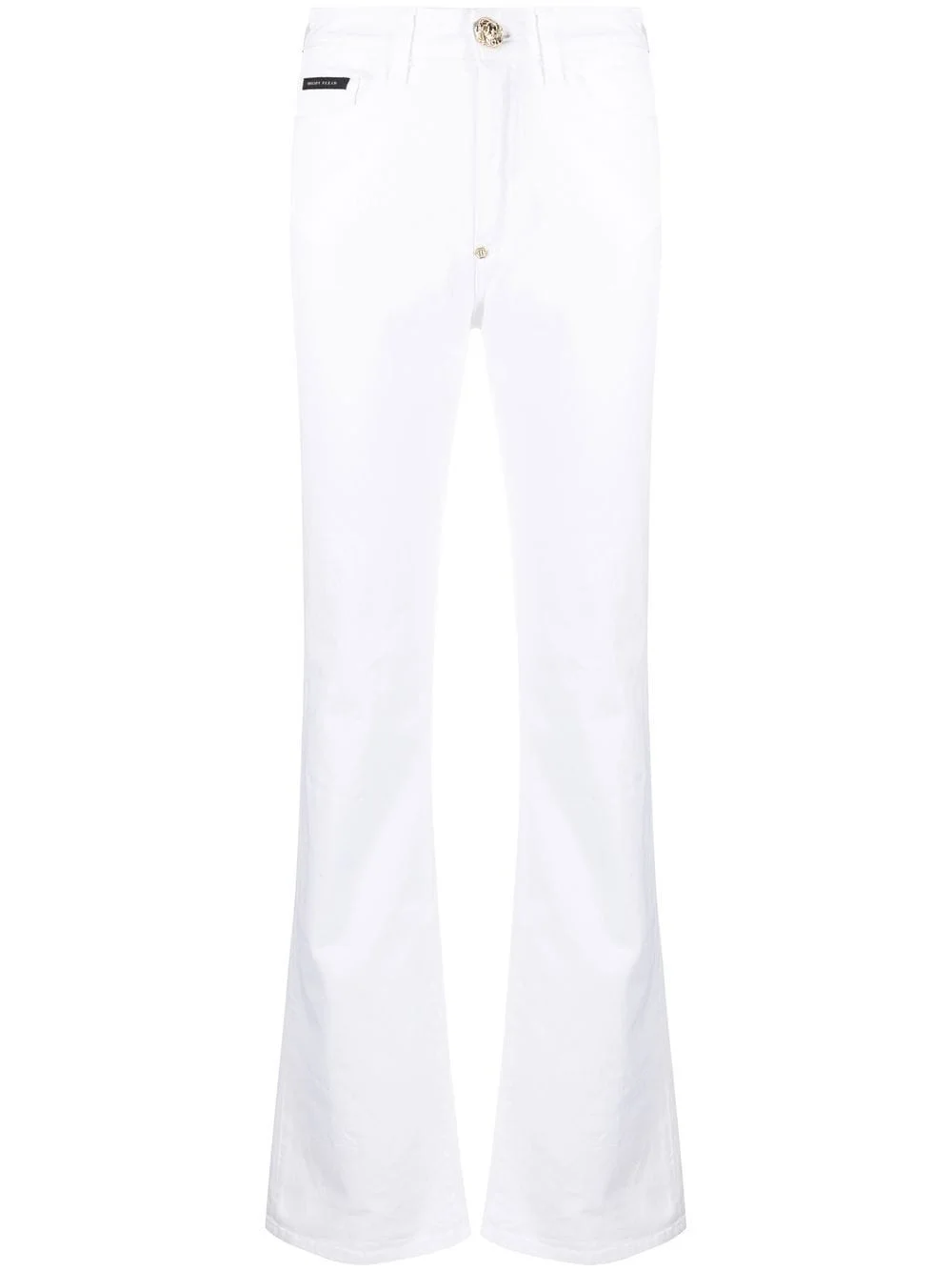 high-waisted flared jeans white cotton blend gold-tone logo plaque logo tag high waist flared belt loops concealed fly and button fastening classic five pockets Made in Italy Composition Outer: Cotton 93%, Polyester 5%, Spandex/Elastane 2% Lining: Polyester 65%, Cotton 35% SIZE & FIT Model measurements Height 5 ft 10 in(1.78 m) Bust/Chest 31.49 in(80 cm) Hips 36.22 in(92 cm) Waist 25.59 in(65 cm) FittingInformation Designed with a flared hem, these jeans allow for a close fit at the waist with a slim fit over the leg and widening towards the hem Constructed from stretch denim, this piece offers a stretch fit with durability This piece fits true to size – take your usual size Washing instructions Machine Wash