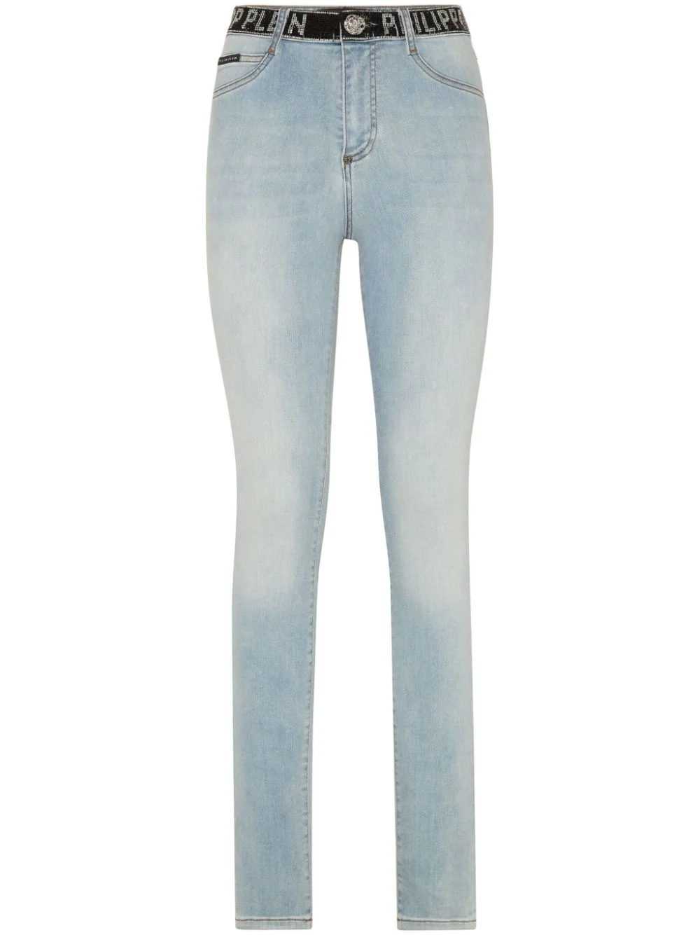 high-waisted jeggings Highlights - Light blue - Cotton blend - Denim - Front button and zip fastening - High-waisted - Belt loops - Logo waistband - Classic five pockets - Logo patch to the rear Imported Composition Polyester 100%, Glass Fiber 100%, Cotton 92%, Elastomultiester 6%, Elastane 2%