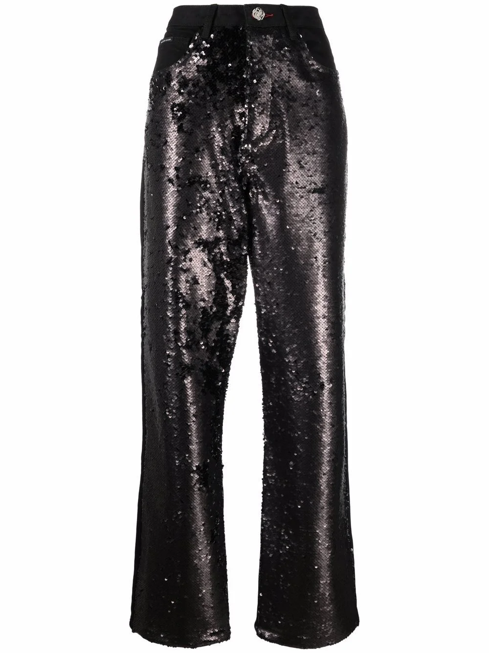high-waisted sequined jeans black cotton panelled design sequin embellishment logo patch to the rear tonal stitching high waist belt loops front button and zip fastening classic five pockets straight leg ankle-length Imported Composition Lining: Polyester 65%, Cotton 35% Outer: Cotton 100%, Calf Leather 100%, Polyester 100% SIZE & FIT Model measurements Height 5 ft 10 in(1.78 m) Bust/Chest 33.07 in(84 cm) Hips 36.61 in(93 cm) Waist 24.8 in(63 cm) FittingInformation This piece fits true to size. We recommend you get your regular size Designed to be fitted at the waist and hips, loose over the leg Made with a mid-weight non-stretch fabric Washing instructions Hand Wash