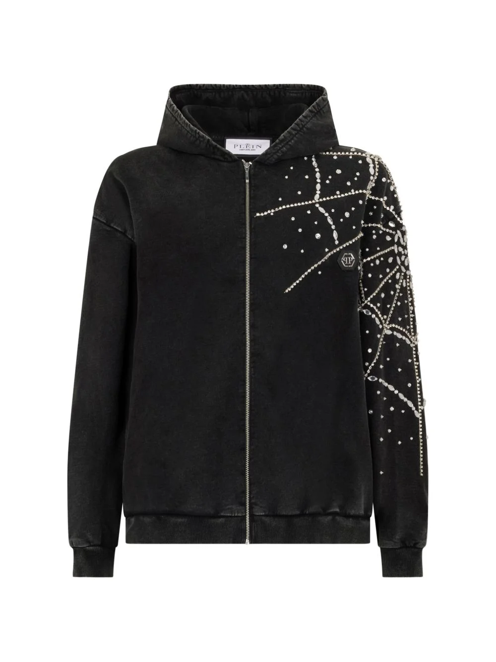 hooded knitwear Highlights - Black - Strass embellishment - Zip fastening - Hood - Spiderweb pattern Imported Composition Fabric 100%
