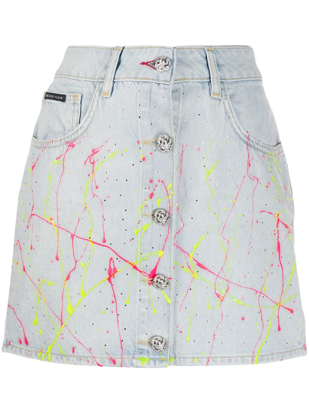 hot n' cold denim skirt Multicolour cotton hot n' cold denim skirt from Philipp Plein featuring a high rise, a front button fastening, a waistband with belt loops, decorative buttons, a five pocket design, a short length, crystal embellishments and a fitted silhouette. Imported Composition Outer: Cotton 100% Lining: Polyester 65%, Cotton 35% Washing instructions Hand Wash