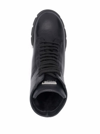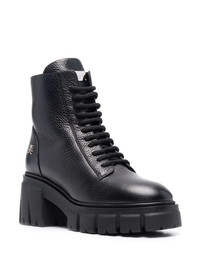 Iconic Plein boots black leather ankle-length skull charm logo plaque at the tongue round toe front lace-up fastening branded insole mid block heel Imported Composition Outer: Leather 100% Sole: Rubber 100% Lining: Sheep Skin/Shearling 100% SIZE & FIT Measurement HEEL 2.95 in(7.5 cm) HEIGHT 5.51 in(14 cm) Sole height 1.18 in(3 cm)