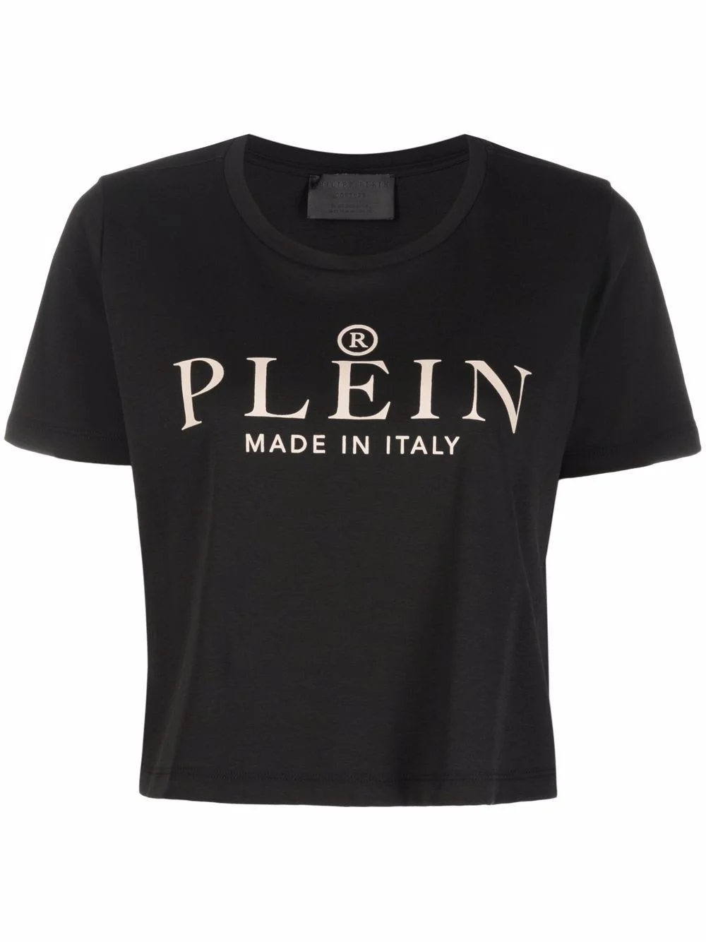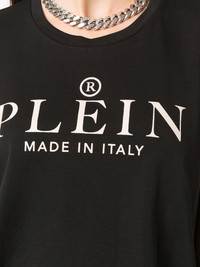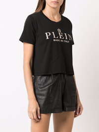 Iconic Plein short-sleeve cropped T-shirt black/white cotton jersey knit logo print to the front round neck short sleeves straight hem cropped Made in Italy Composition Cotton 100% SIZE & FIT Model measurements Height 5 ft 10 in(1.78 m) Bust/Chest 33.07 in(84 cm) Hips 35.82 in(91 cm) Waist 26.96 in(68.5 cm) FittingInformation This piece fits true to size. We recommend you get your regular size Cut for a loose fit Made with a mid-weight fabric Washing instructions Hand Wash