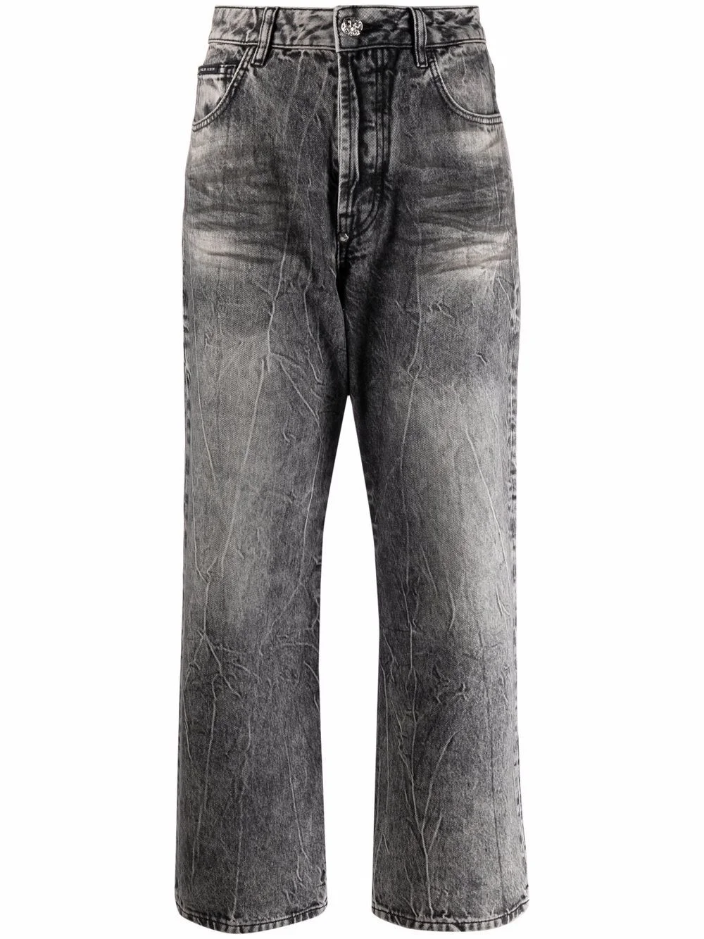 Iconic Plein wide-leg jeans powder grey cotton-blend acid wash high waist belt loops front button and zip fastening classic five pockets cropped Imported Composition Lining: Polyester 65%, Cotton 35% Outer: Cotton 100% SIZE & FIT Model measurements Height 5 ft 10 in(1.79 m) Bust/Chest 33.07 in(84 cm) Hips 35.82 in(91 cm) Waist 24.01 in(61 cm) FittingInformation This piece fits true to size. We recommend you get your regular size Designed to be fitted at the waist and hips, loose over the leg Made with a mid-weight non-stretch fabric Washing instructions Dry Clean Only