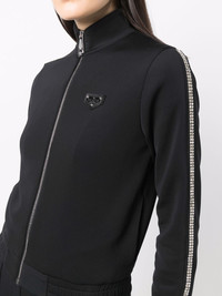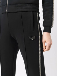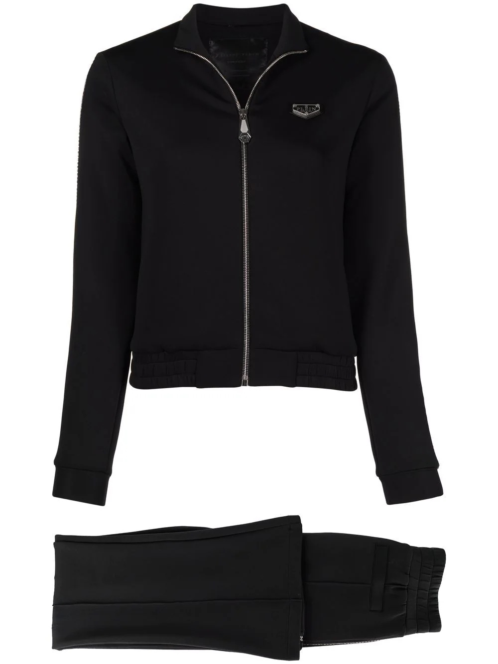 Black jogging jacket and trousers set from PHILIPP PLEIN featuring logo plaque, crystal embellishment, high neck, front zip fastening, long sleeves, contrasting trim, ribbed cuffs, elasticated waistband, straight leg and full-length. Highlights - Black - Logo plaque - Crystal embellishment - High neck - Front zip fastening - Long sleeves - Contrasting trim - Ribbed cuffs - Elasticated waistband - Straight leg - Full-length Made in Italy Composition Polyester 87%,Spandex/Elastane 13%