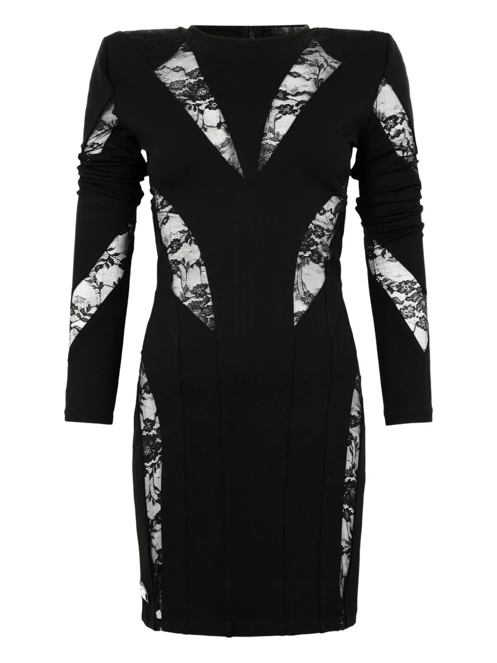 lace long-sleeve mini dress Highlights - Black - Lace inserts - Long sleeves - Zip fastening Imported Composition Outer: Viscose 70%, Polyester 22%, Spandex/Elastane 8% Lining: Polyester 85%, Spandex/Elastane 15% Washing instructions Read Manufacturer Guidelines