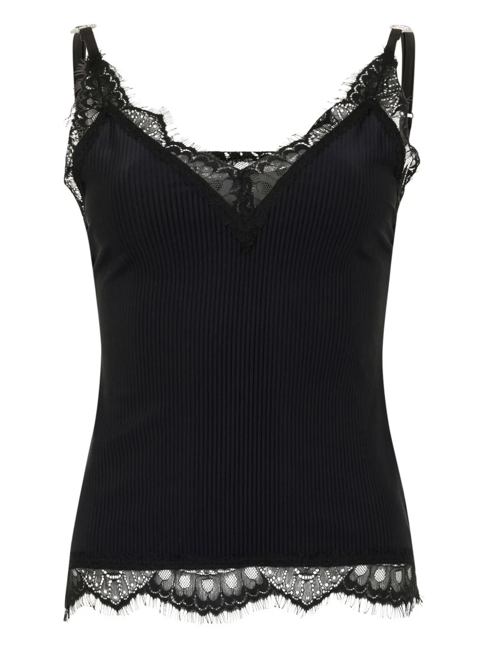 lace ribbing tank top Highlights - Black - Lace trim - Adjustable straps - Ribbing - V-neck Imported Composition Polyester 100%, Polyamide 81%, Spandex/Elastane 19% Washing instructions Read Manufacturer Guidelines