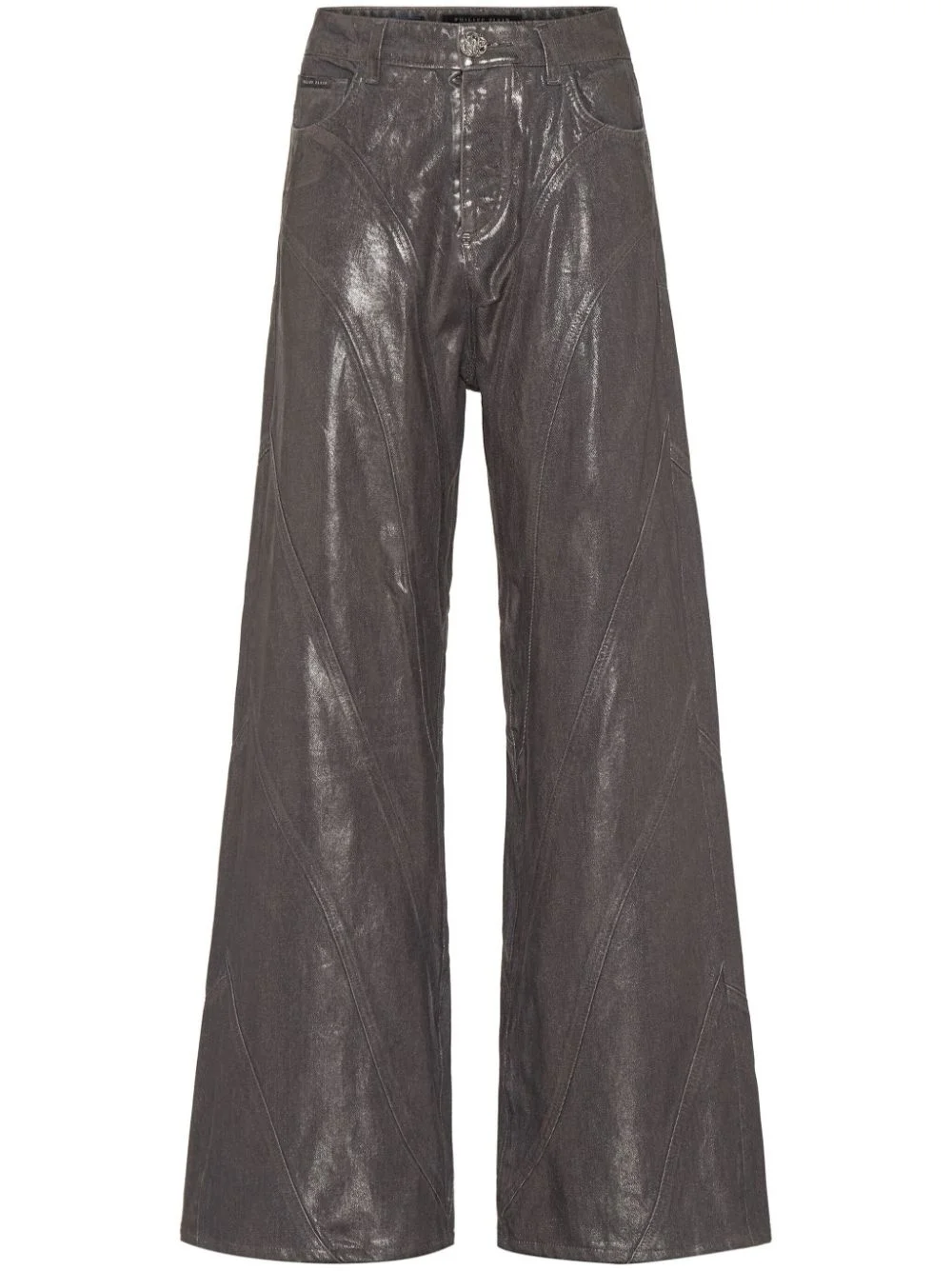 laminated flared jeans Highlights - Silver-tone - Cotton blend - Laminated finish - Front button and zip fastening - Wide leg - Belt loops - Classic five pockets - Flared design Imported Composition Outer: Cotton 100%, Polyester 100% Lining: Polyester 65%, Cotton 35% Washing instructions Read Manufacturer Guidelines