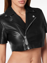 leather cropped biker jacket Highlights - Black - Lambskin - Wide peak lapels - Off-centre front zip fastening - Short sleeves - Cuff zips - Straight hem - Cropped - Leopard print lining Made in Italy Composition Lamb Skin 100% Washing instructions Specialist Cleaning