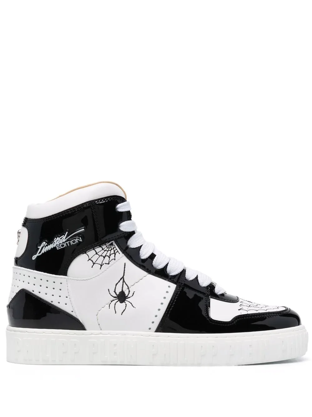 leather high-top sneakers white/black leather embroidered spider design front lace-up fastening flat rubber sole logo-print tongue Made in Italy Composition Leather 100% SIZE & FIT Measurement HEEL 1.18 in(3 cm) HEIGHT 4.72 in(12 cm) Sole height 0.98 in(2.5 cm)