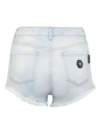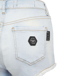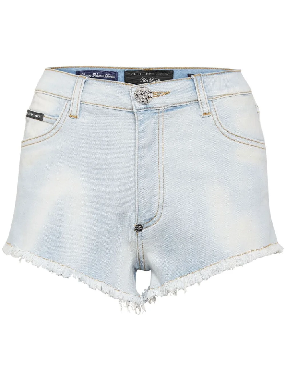 logo-applique denim shorts Highlights - Light blue - Cotton blend - Washed denim - Contrast stitching - Applique logo - Mini logo tag - Belt loops - Concealed fly and button fastening - High-waisted - Classic five pockets - Frayed hem - Thigh-length Imported Composition Outer: Cotton 92%, Polyester 6%, Spandex/Elastane 2% Lining: Polyester 65%, Cotton 35%