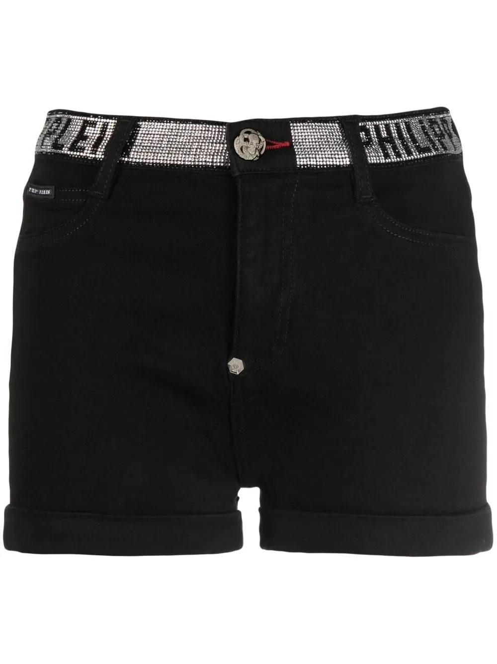 logo-embellished denim shorts Produced in a black denim construction, these Philipp Plein shorts are defined by a bold logo waistband with shimmering crystal embellishment, exhibiting the brand's penchant for extravagant details. Highlights - Black - Stretch-cotton - Crystal embellishment - Logo waistband - Turn-up hem - Belt loops - Classic five pockets - Front button and zip fastening Imported Composition glass 100%, Cotton 92%, Polyester 6%, Spandex/Elastane 2% SIZE & FIT Model measurements Height 5 ft 10 in(1.77 m) Bust/Chest 32.28 in(82 cm) Hips 34.64 in(88 cm) Waist 24.4 in(62 cm) Washing instructions Hand Wash