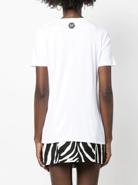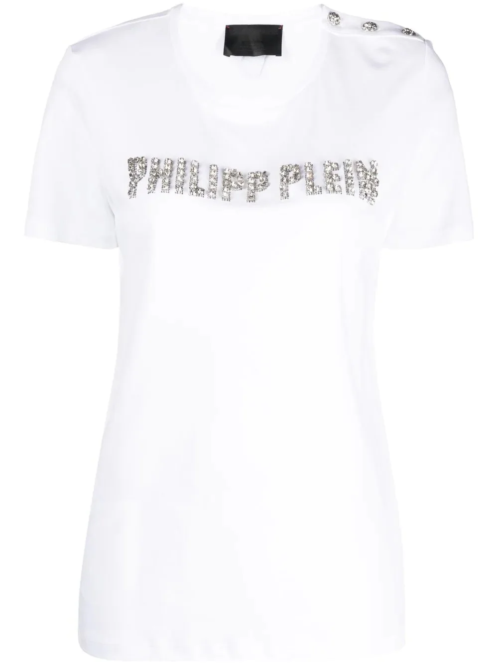 logo-embellished short-sleeve T-shirt white cotton glass crystal embellishment logo embellishment decorative button detailing logo patch to the rear round neck short sleeves straight hem Made in Italy Composition Cotton 100%, glass 100% SIZE & FIT Model measurements Height 5 ft 10 in(1.77 m) Bust/Chest 29.92 in(76 cm) Hips 34.25 in(87 cm) Waist 23.62 in(60 cm) FittingInformation This piece fits true to size. We recommend you get your regular size Cut for a relaxed fit Made with a mid-weight fabric Washing instructions Hand Wash