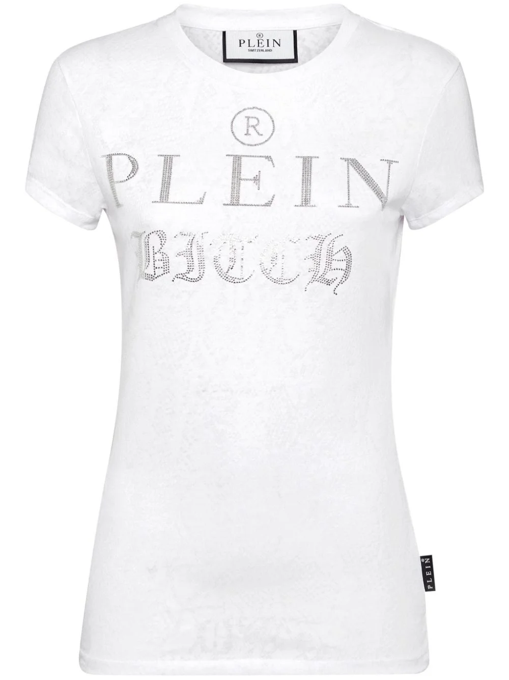 logo-embellished T-shirt Highlights - White - Cotton blend - Logo embellishment - Slip-on style - All-over snakeskin print - Crew neck - Short sleeves Imported Composition glass 100%, Polyester 50%, Cotton 50%