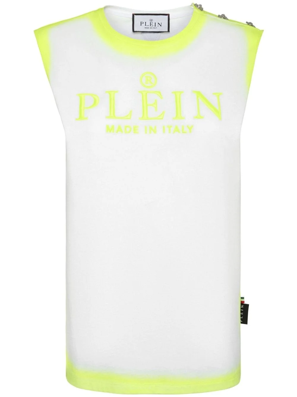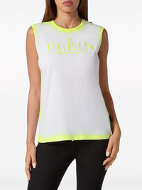 logo-embroidered cotton tank top Highlights - White/fluorescent yellow - Cotton - Jersey texture - Contrasting trim - Applique logo - Embroidered logo to the front - Crew neck - Sleeveless - Straight hem Made in Italy Composition Cotton 100%, Zinc 100%, Polyester 100%