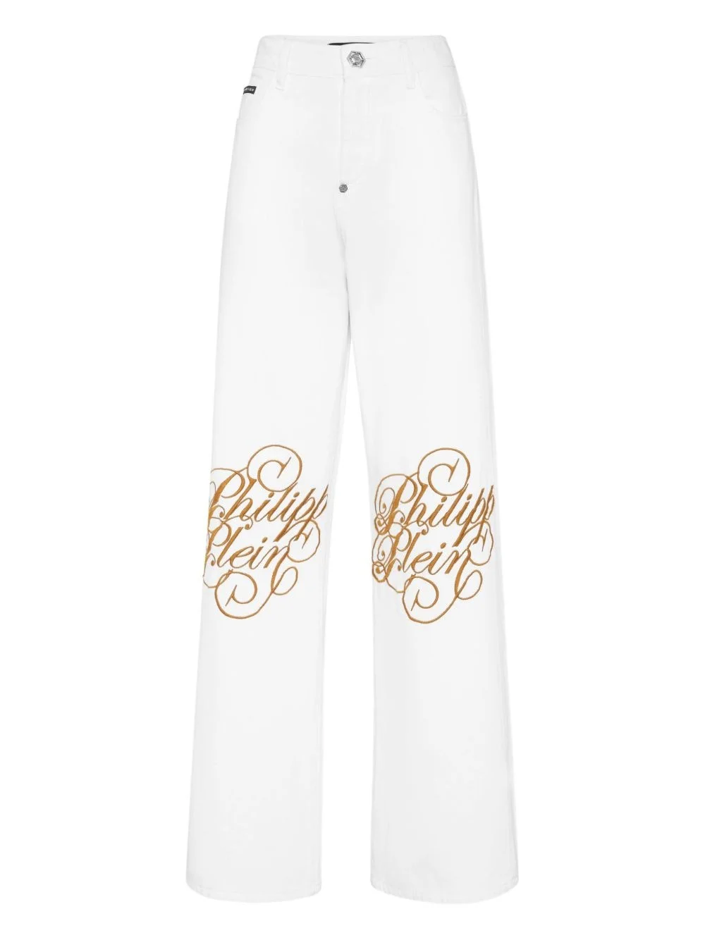 logo-embroidered jeans Highlights - White - Concealed fly and button fastening - Belt loops - Classic five pockets - Wide leg Imported Composition Outer: Cotton 100%, Polyester 100%, Calf Leather 100% Lining: Polyester 65%, Cotton 35% Washing instructions Read Manufacturer Guidelines