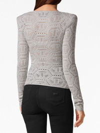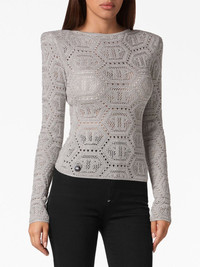 logo-embroidered knitted top Highlights - Medium grey - Logo patch to the front - Embroidered design - Shoulder pads - Round neck - Long sleeves - Straight hem Made in Italy Composition Acetate 78%, Metallized Polyester 12%, Polyamide 10% Washing instructions Read Manufacturer Guidelines