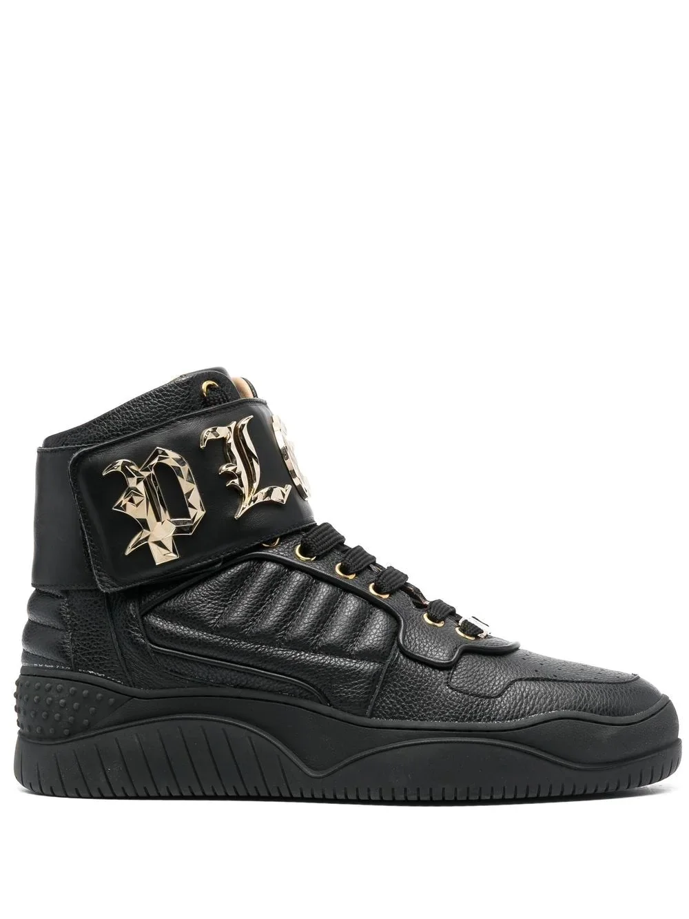 logo high-top sneakers black calf leather flat rubber sole gold-tone logo lettering gold-tone logo plaque front lace-up fastening round toe perforated toebox ankle-length branded insole Made in Italy Composition Leather 100% SIZE & FIT Measurement HEEL 1.18 in(3 cm) HEIGHT 4.33 in(11 cm) Sole height 0.98 in(2.5 cm)