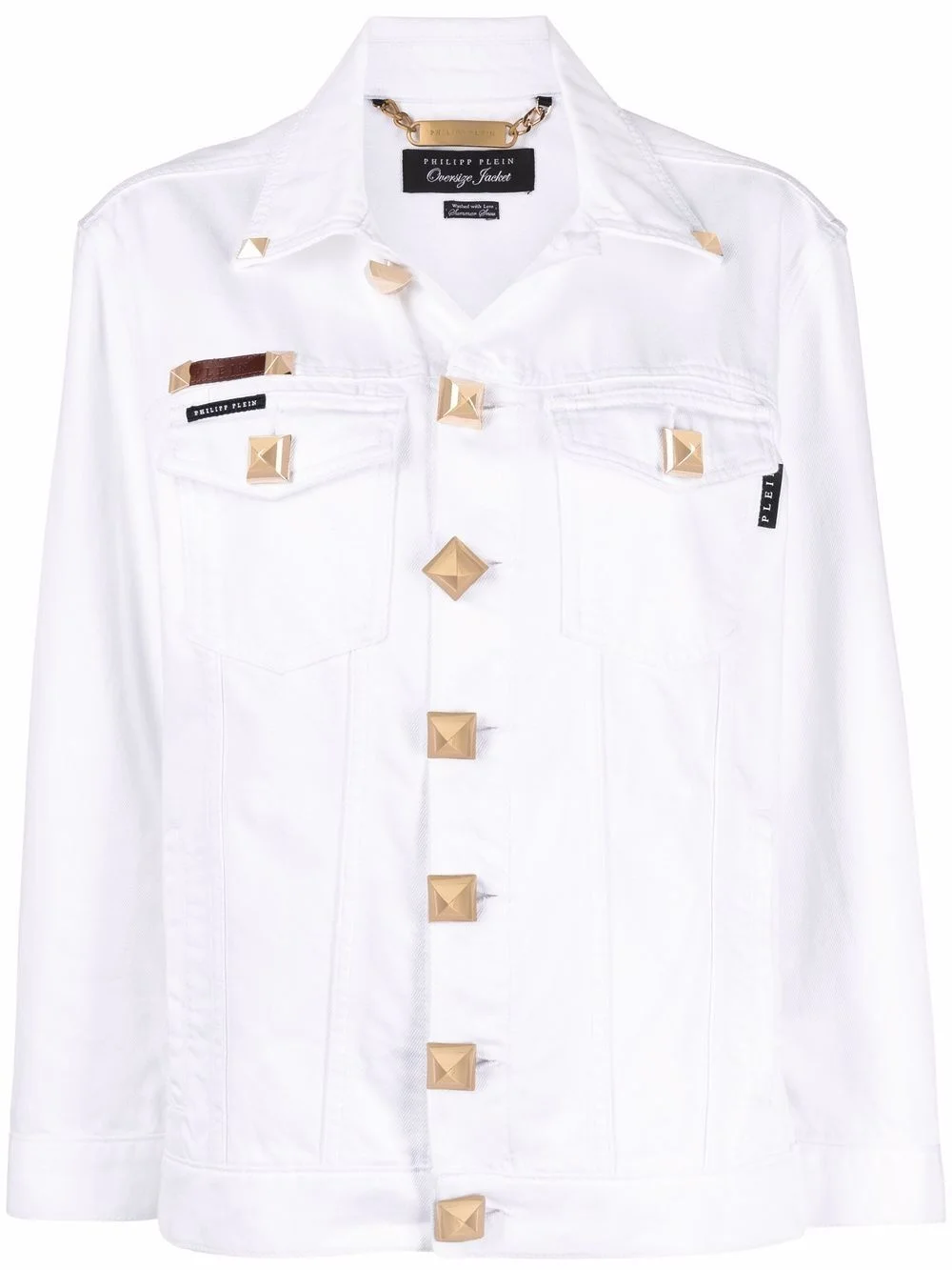 logo-patch denim jacket Philipp Plein's distinctive style is showcased in this single-breasted jacket. Featuring multiple logo patches at the front and gold-tone hardware buttons, this design blends creativity with opulence. Imported Composition Lining: Polyester 65%, Cotton 35% Outer: Cotton 100% SIZE & FIT Model measurements Height 5 ft 10 in(1.79 m) Bust/Chest 31.49 in(80 cm) Hips 34.25 in(87 cm) Waist 22.83 in(58 cm) FittingInformation This piece fits true to size. We recommend you get your regular size Cut for a loose fit Made with a mid-weight non-stretch fabric Washing instructions Dry Clean Only