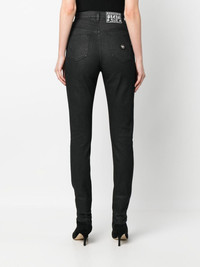 high-waisted denim leggings black cotton blend coated finish high-waisted logo plaque logo patch to the rear belt loops concealed fly and button fastening super-skinny cut Made in Italy Composition Outer: Calf Leather 100%, Cotton 74%, Polyester 24%, Spandex/Elastane 2% Lining: Polyester 65%, Cotton 35% SIZE & FIT Model measurements Height 5 ft 10 in(1.78 m) Bust/Chest 31.49 in(80 cm) Hips 36.22 in(92 cm) Waist 25.59 in(65 cm) FittingInformation This piece fits small – you might want to get one size up Cut for a close fit Made with a mid-weight stretch fabric Washing instructions Machine Wash