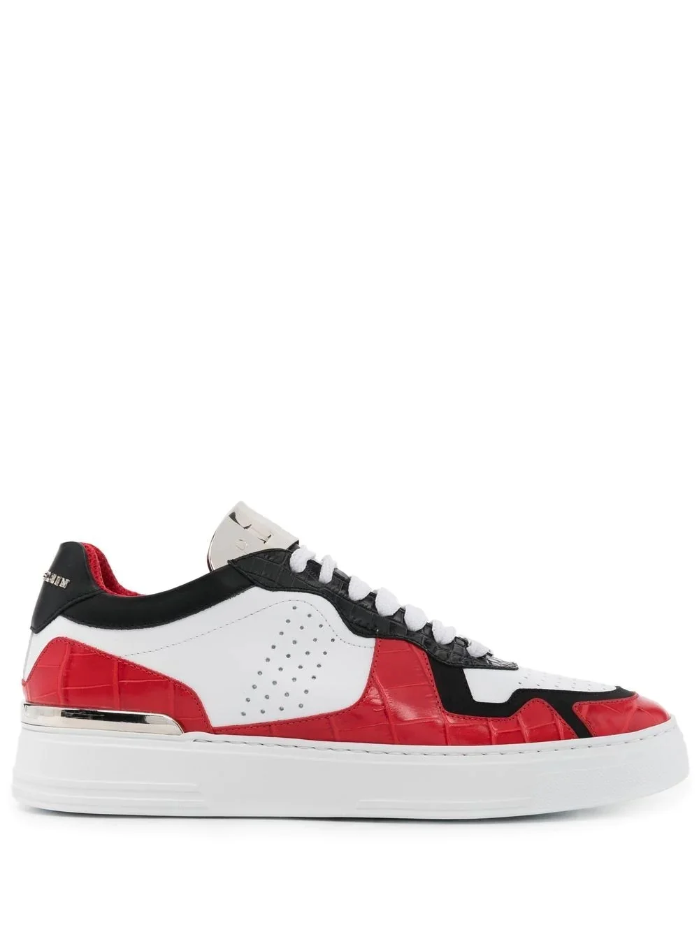 colour-block low-top sneakers red leather colour-block panelled design embossed crocodile effect perforated detailing logo-embossed tongue silver-tone logo lettering front lace-up fastening round toe flat rubber sole Made in Italy Composition Lining: Leather 100%, Fabric 100% Outer: Leather 100% Sole: Rubber 100% SIZE & FIT Measurement HEEL 1.77 in(4.5 cm) Sole height 1.18 in(3 cm)