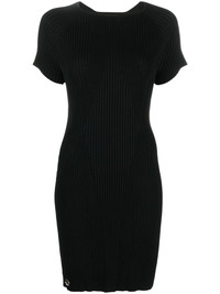 logo-plaque ribbed T-shirt dress jet black ribbed knit logo plaque backless round neck short sleeves Made in Italy Composition Viscose 70%, Polyester 30% SIZE & FIT Model measurements Height 6 ft 2 in(1.89 m) Bust/Chest 37.4 in(95 cm) Hips 36.61 in(93 cm) Waist 29.13 in(74 cm) FittingInformation This piece fits true to size. We recommend you get your regular size Cut for a close fit Made with a mid-weight fabric Washing instructions Hand Wash