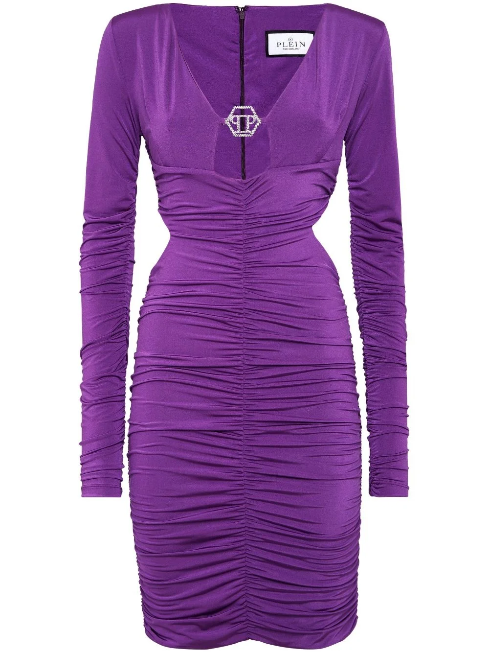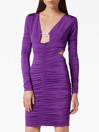 logo-plaque ruched minidress Highlights - Purple - Stretch-design - Silver-tone logo plaque - Crystal embellishment - Cut-out detailing - Ruched detailing - Long sleeves - Thigh-length Imported Composition Polyester 97%, Elastane 3% SIZE & FIT FittingInformation Designed for a close fit throughout Made from a midweight stretch fabric, this piece offers elasticity and flexibility when worn This piece fits true to size – take your usual size