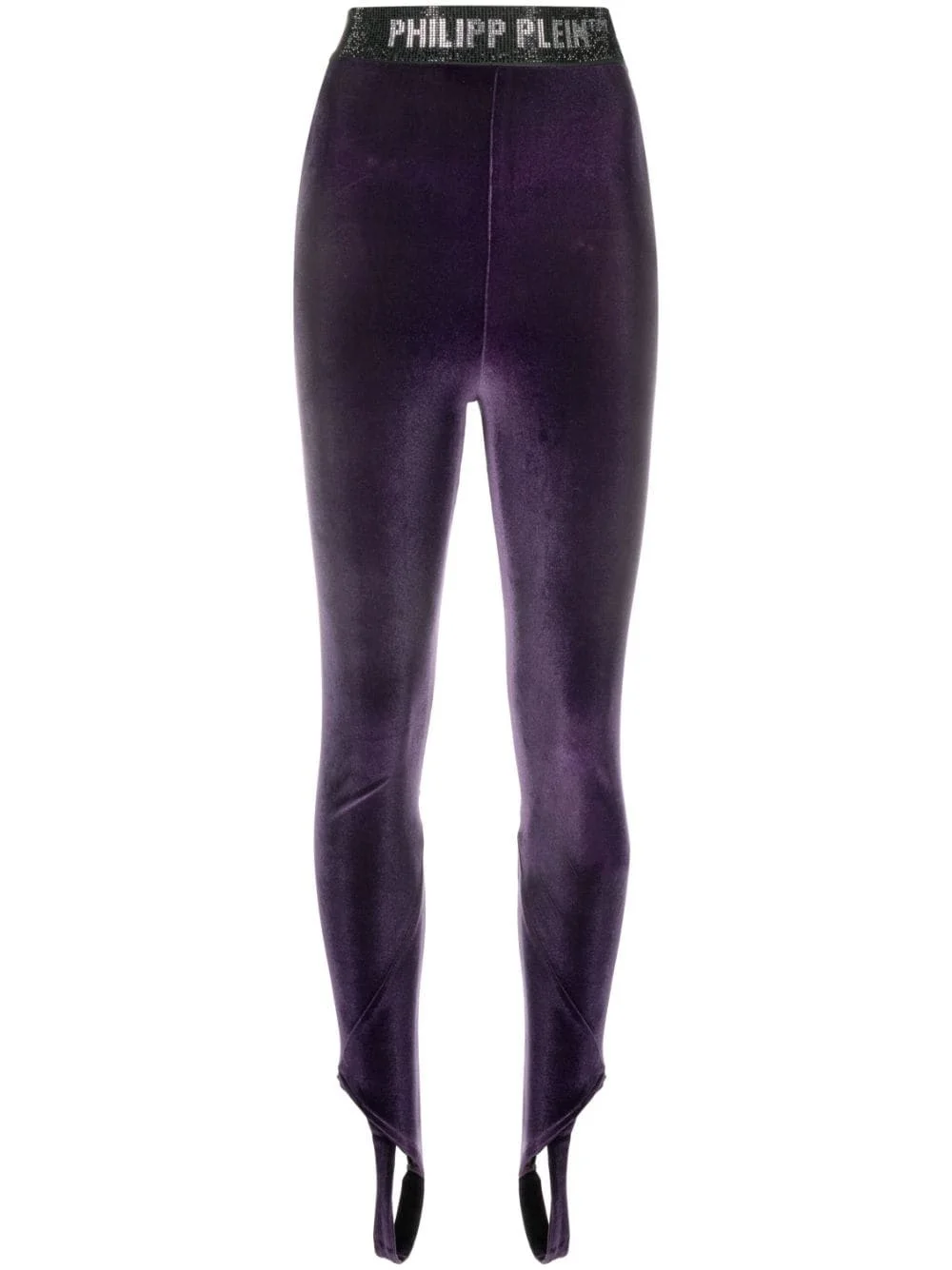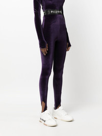 logo-underband velvet leggings Bold logos and rock ‘n’ roll finishes are part of Philip Plein's style code. These leggings are a prime example with their crystal-embellished logo waistband and velvet texture. Highlights - Dark purple - Velvet effect - Logo waistband - Crystal embellishment - High-waisted - Elasticated waistband - Super-skinny cut - Stirrup cuffs Imported Composition Polyester 95%, Spandex/Elastane 5% SIZE & FIT Model measurements Height 5 ft 11 in(1.8 m) Bust/Chest 31.49 in(80 cm) Hips 36.61 in(93 cm) Waist 24.4 in(62 cm) FittingInformation Designed for a close fit throughout The elasticated stirrups allow for a close and secure fit Made from a midweight stretch fabric, this piece offers elasticity and flexibility when worn This piece fits true to size – take your usual size
