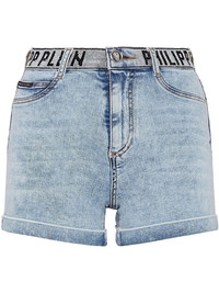 logo-waistband denim shorts Philipp Plein presents an unexpected take on logo detailing with these shorts. In a studded design, it adds a contemporary feel to the denim pair. Imported Composition Cotton 92%, Spandex/Elastane 8%