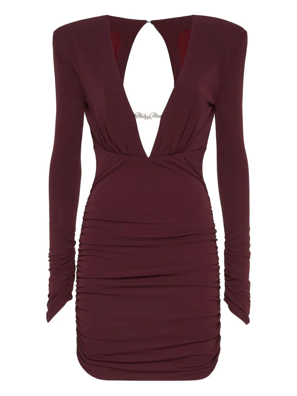 long-sleeved ruched mini dress Highlights - Burgundy - Plunging neckline - Rear zip fastening - Long sleeves - Ruched detailing - Open back Made in Italy Composition Viscose 100%, Metal 100%, Polyamide 75%, Elastane 25% Washing instructions Read Manufacturer Guidelines