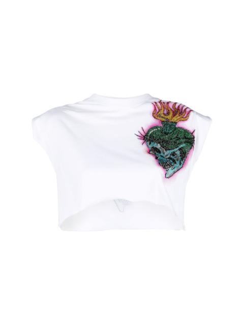 Love Tattoo cropped T-shirt black cotton shoulder pads skull print round neck sleeveless cropped Imported Composition Cotton 100%, glass 100% SIZE & FIT Model measurements Height 5 ft 9 in(1.76 m) Bust/Chest 33.07 in(84 cm) Hips 38.58 in(98 cm) Waist 24.8 in(63 cm) FittingInformation Designed to be unstructured, offering a loose fit throughout The internal shoulder pads offer a structured shape Made from a midweight non-stretch fabric, this piece offers minimal elasticity when worn This piece fits true to size – take your usual size Washing instructions Hand Wash