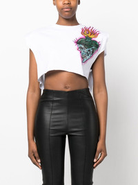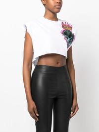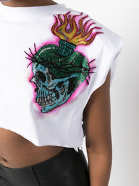 Love Tattoo cropped T-shirt white cotton shoulder pads skull print round neck sleeveless cropped Imported Composition glass 100%, Cotton 100% SIZE & FIT Model measurements Height 5 ft 9 in(1.76 m) Bust/Chest 33.07 in(84 cm) Hips 38.58 in(98 cm) Waist 24.8 in(63 cm) FittingInformation Designed to be unstructured, offering a loose fit throughout The internal shoulder pads offer a structured shape Made from a midweight non-stretch fabric, this piece offers minimal elasticity when worn This piece fits true to size – take your usual size Washing instructions Hand Wash
