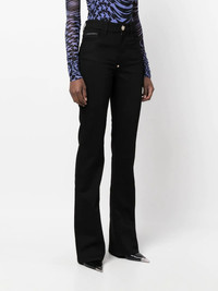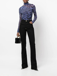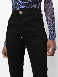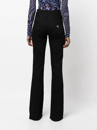 high-waisted flared jeans black cotton blend logo plaque high waist flared front button and zip fastening classic five pockets belt loops Made in Italy Composition Outer: Cotton 98%, Spandex/Elastane 2% Lining: Polyester 65%, Cotton 35% SIZE & FIT Model measurements Height 5 ft 11 in(1.8 m) Bust/Chest 31.49 in(80 cm) Hips 36.61 in(93 cm) Waist 24.4 in(62 cm) FittingInformation Designed with a flared hem, these jeans allow for a close fit at the waist with a slim fit over the leg and widening towards the hem Constructed from stretch denim, this piece offers a stretch fit with durability This piece fits true to size – take your usual size Washing instructions Machine Wash