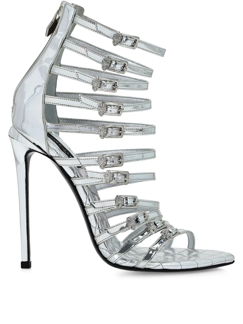Mirror Plein Skull sandals Highlights - Silver-tone - Pointed toe - Multi-way strap design - Rear zip fastening - High stiletto heel Made in Italy Composition Outer: Polyester 40%, Polyurethane 38%, Thermoplastic Polyurethane (TPU) 22% Sole: Calf Leather 100% Lining: Lambskin 100% SIZE & FIT Measurement HEEL 4.72 in(12 cm)